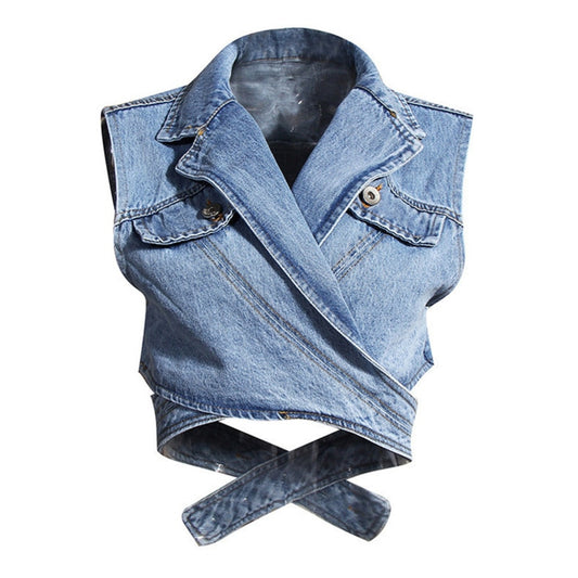 Distinctive two-piece set, a blue denim blouse with an unusual cut, a white loose-fitting long-sleeved shirt and a buttoned-collar