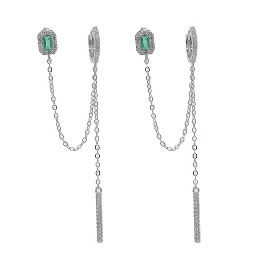 double piercing silver color / rose, gold, clear green, baguette cubic zirconia / long chain earring