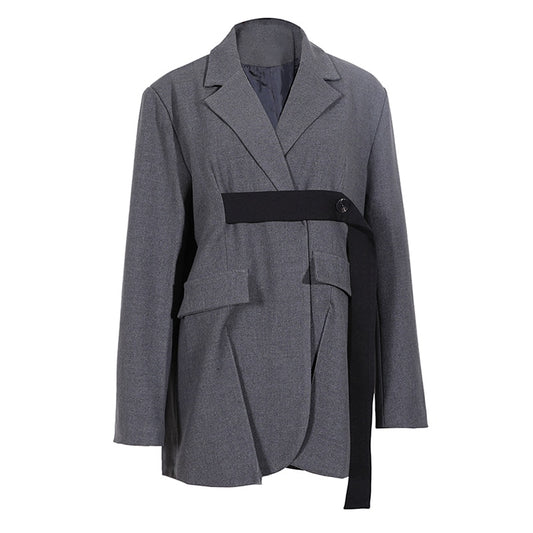 [EAM] Women Gray Ribbon Slit Big Size Blazer New Lapel Long Sleeve Loose Fit Jacket Fashion Tide Spring Autumn 2022 1DE8957