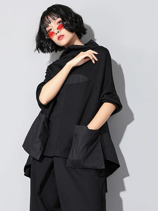 [EAM] Women Black Loose Pocket Irregular Hem Big Size T-shirt New Turtleneck Long Sleeve Fashion Tide Spring Autumn 2022 JQ01801