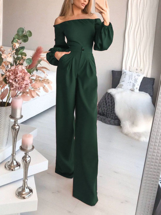 Off-the-shoulder jumpsuit, long sleeves with gathered edges, and a wide leg